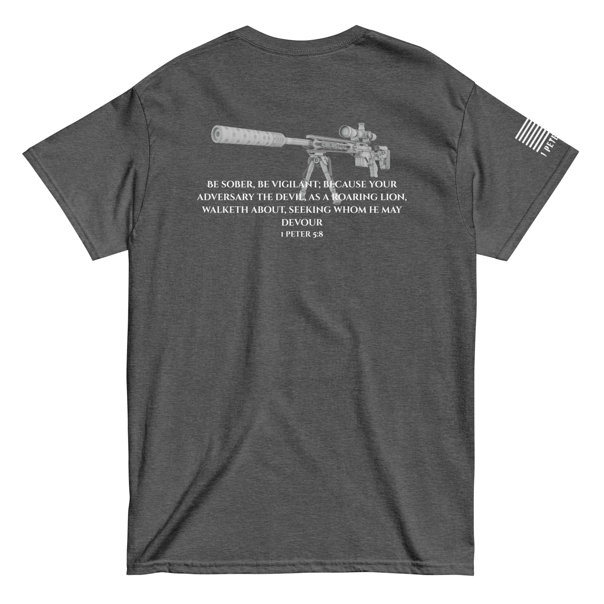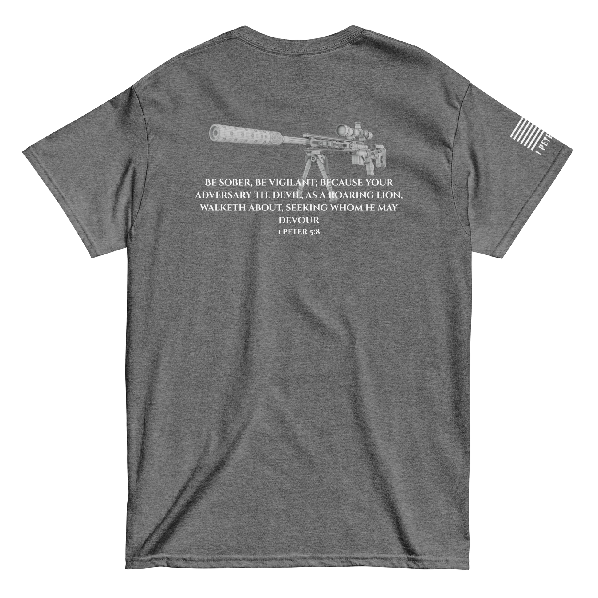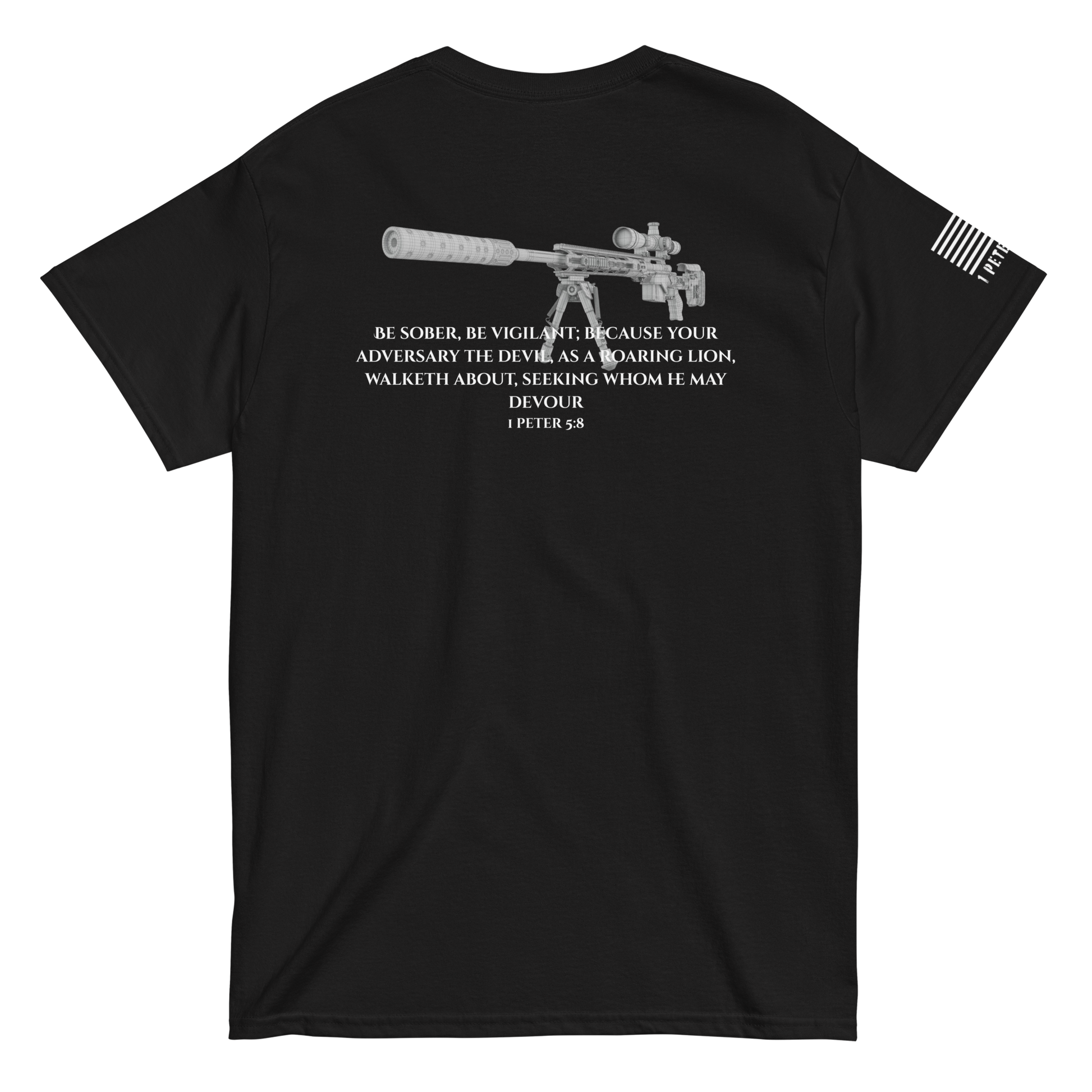 Gear up for the unseen. This classic-fit Gildan 5000 tee is built for those who see what others ignore. Anchored in 1 Peter 5:8, this design pairs spiritual awareness with marksman precision—because every believer is called to watch, wait, and strike back against the darkness.
