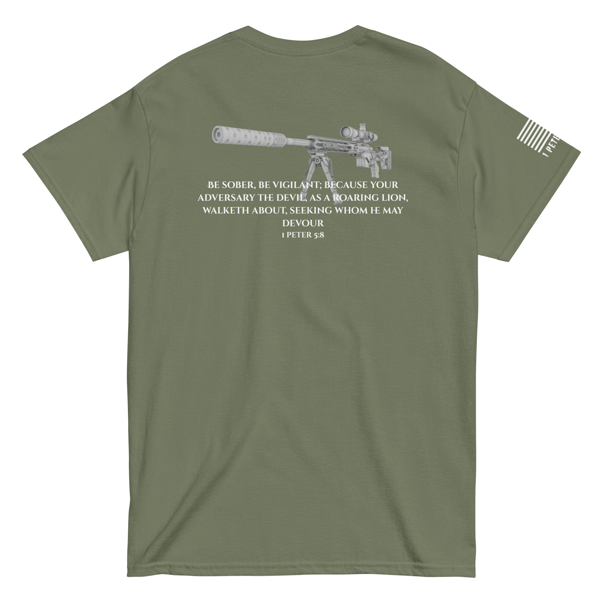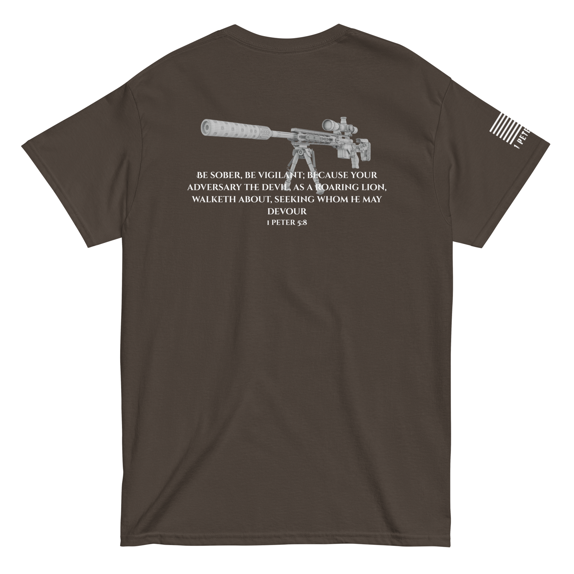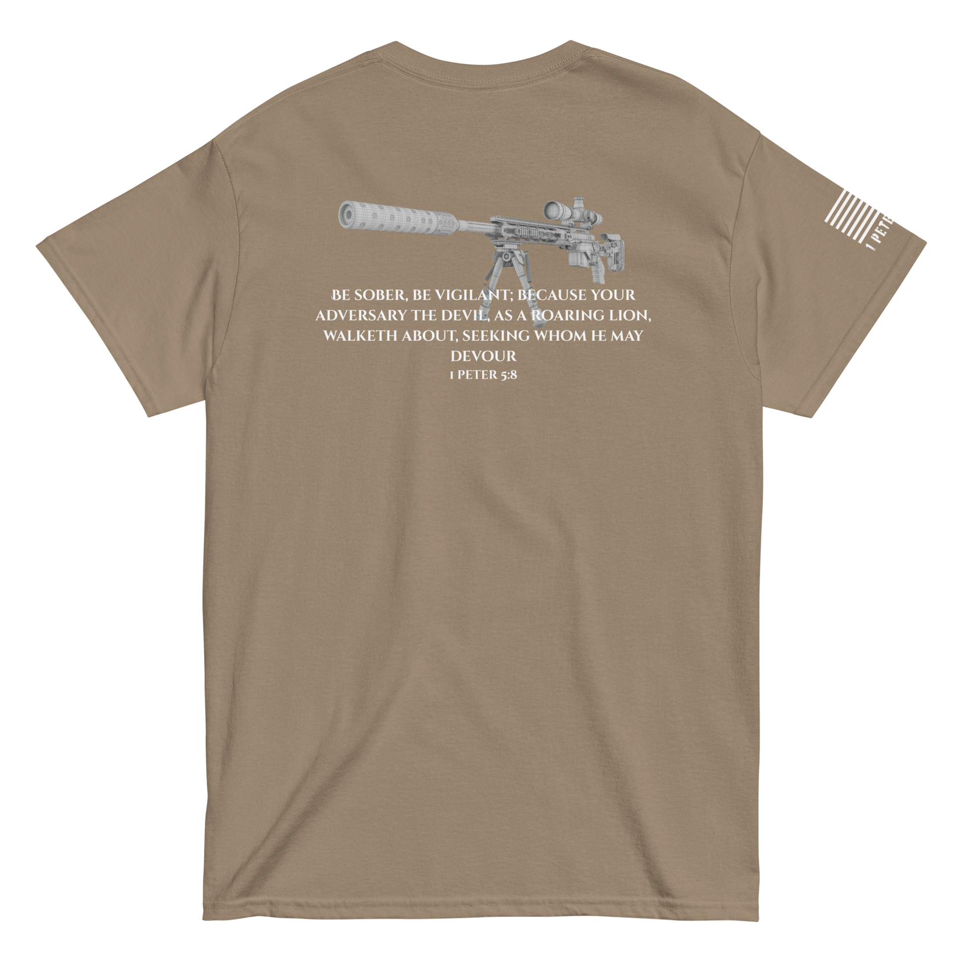Gear up for the unseen. This classic-fit Gildan 5000 tee is built for those who see what others ignore. Anchored in 1 Peter 5:8, this design pairs spiritual awareness with marksman precision—because every believer is called to watch, wait, and strike back against the darkness.