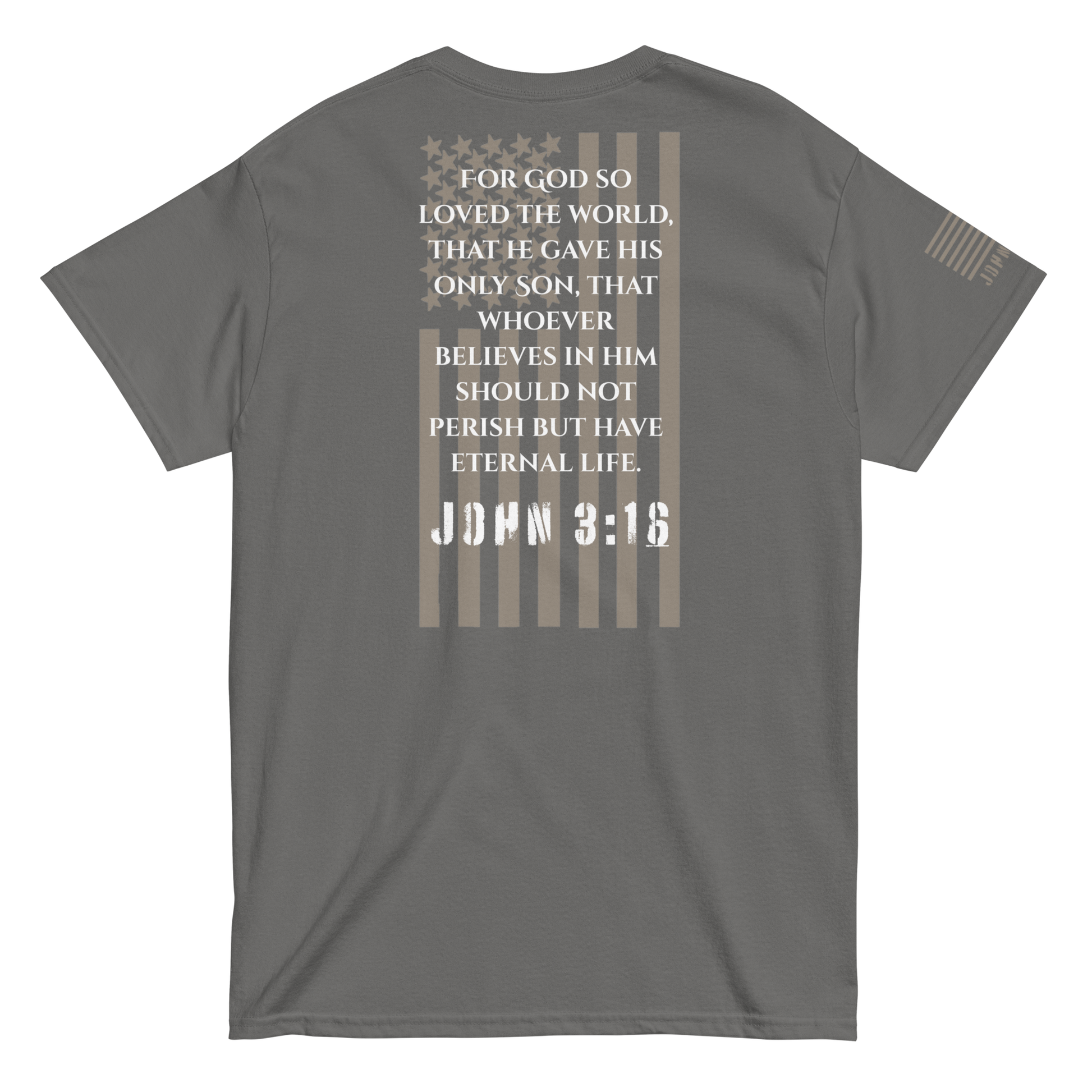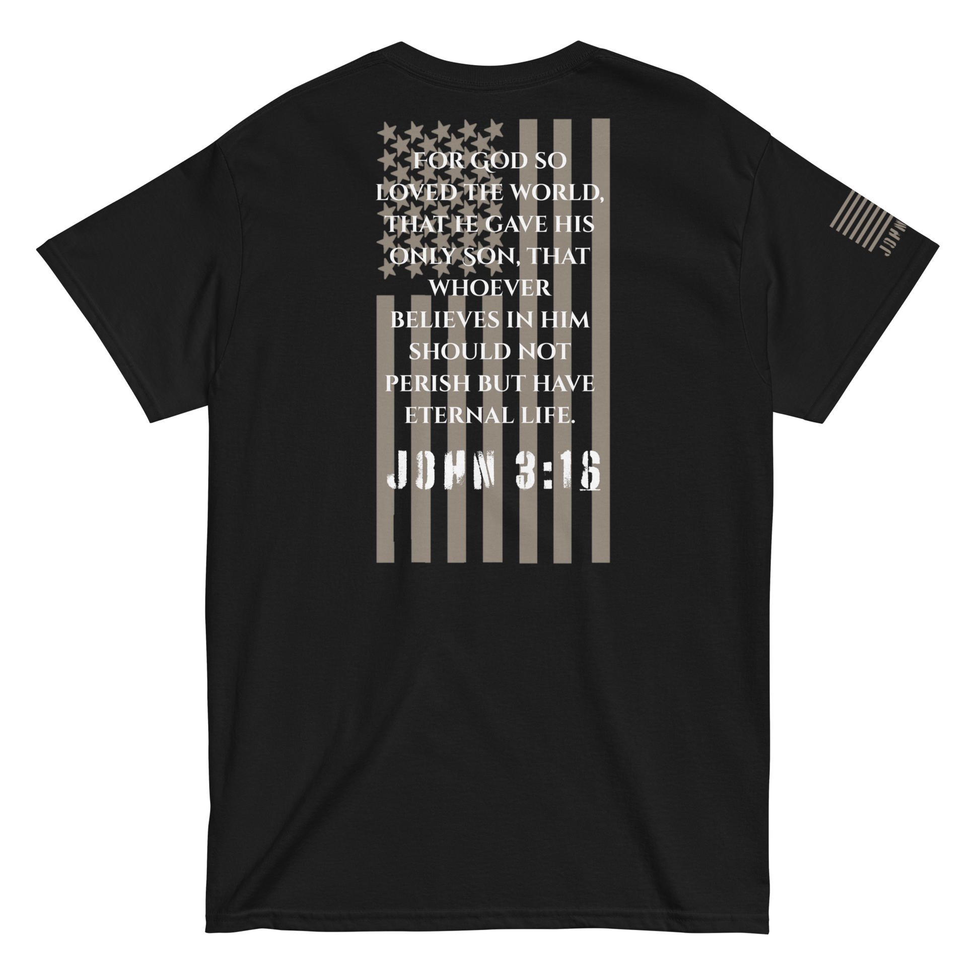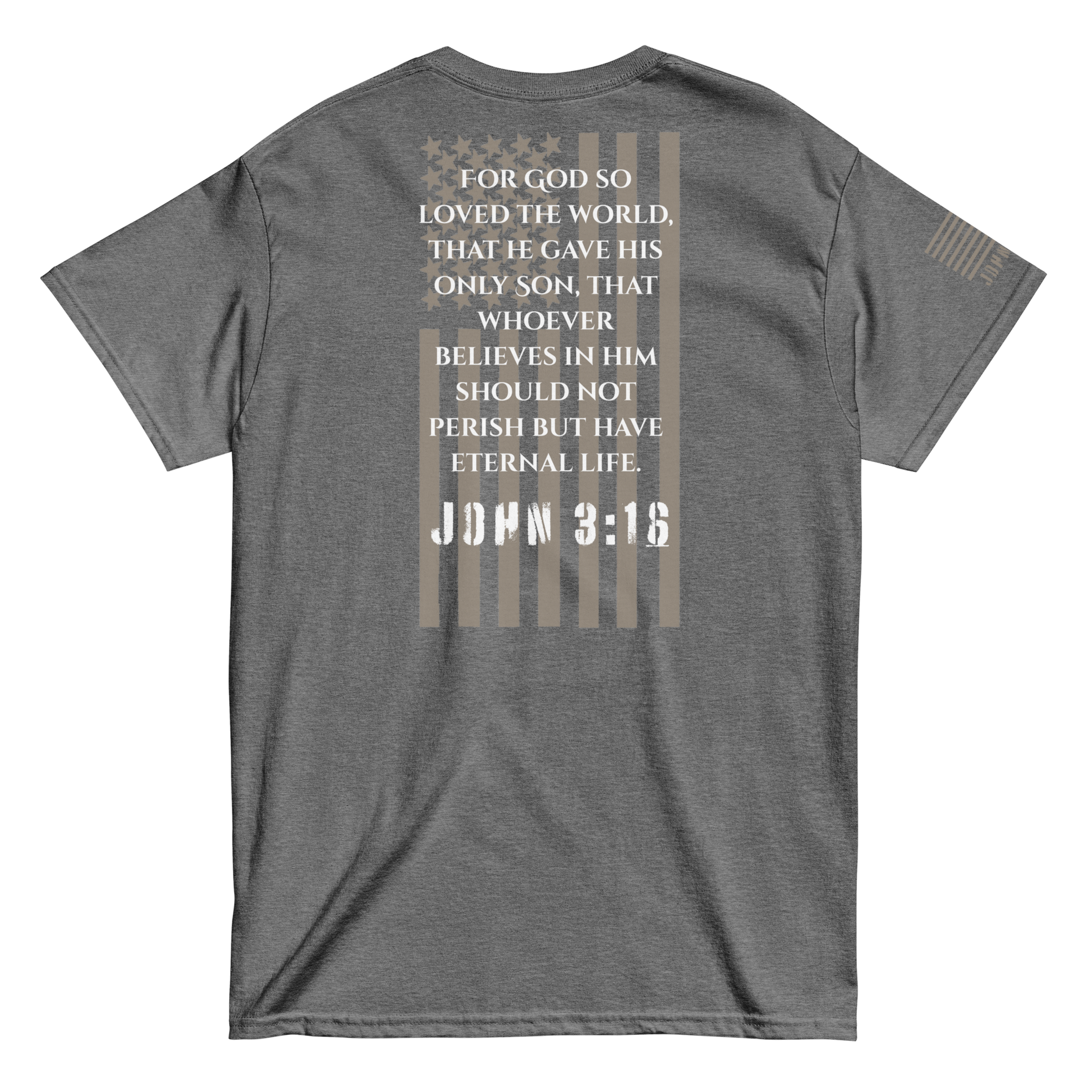 Gear up with purpose. This classic-fit Gildan 5000 tee is your daily reminder that belief is your strongest weapon. Inspired by John 3:16, built to go the distance.