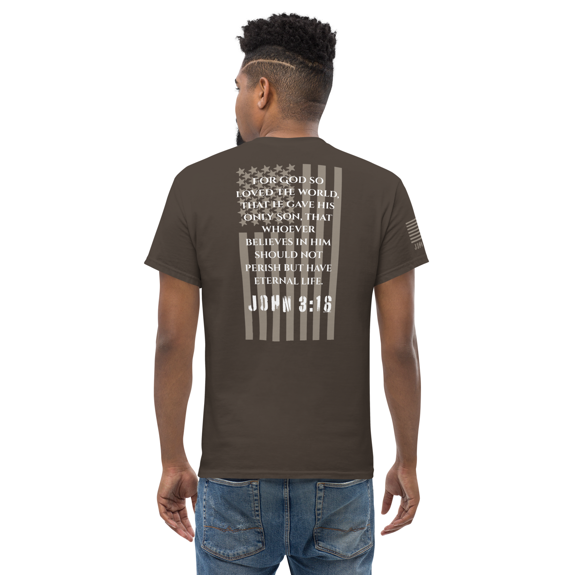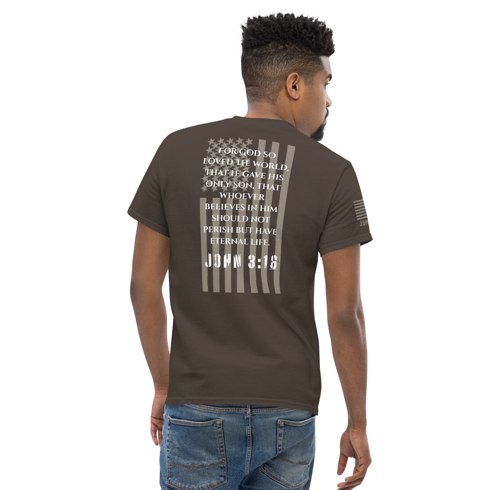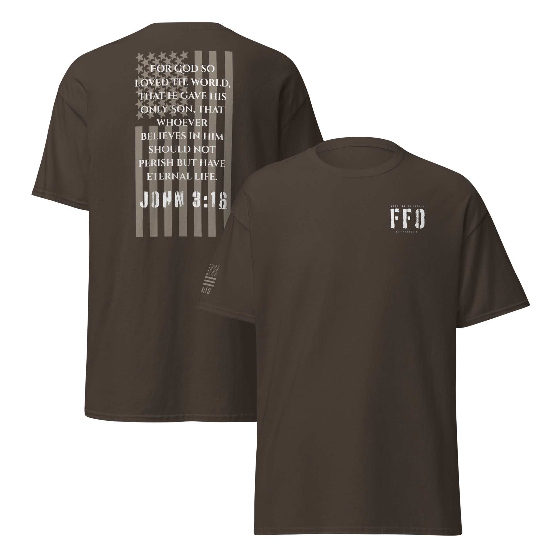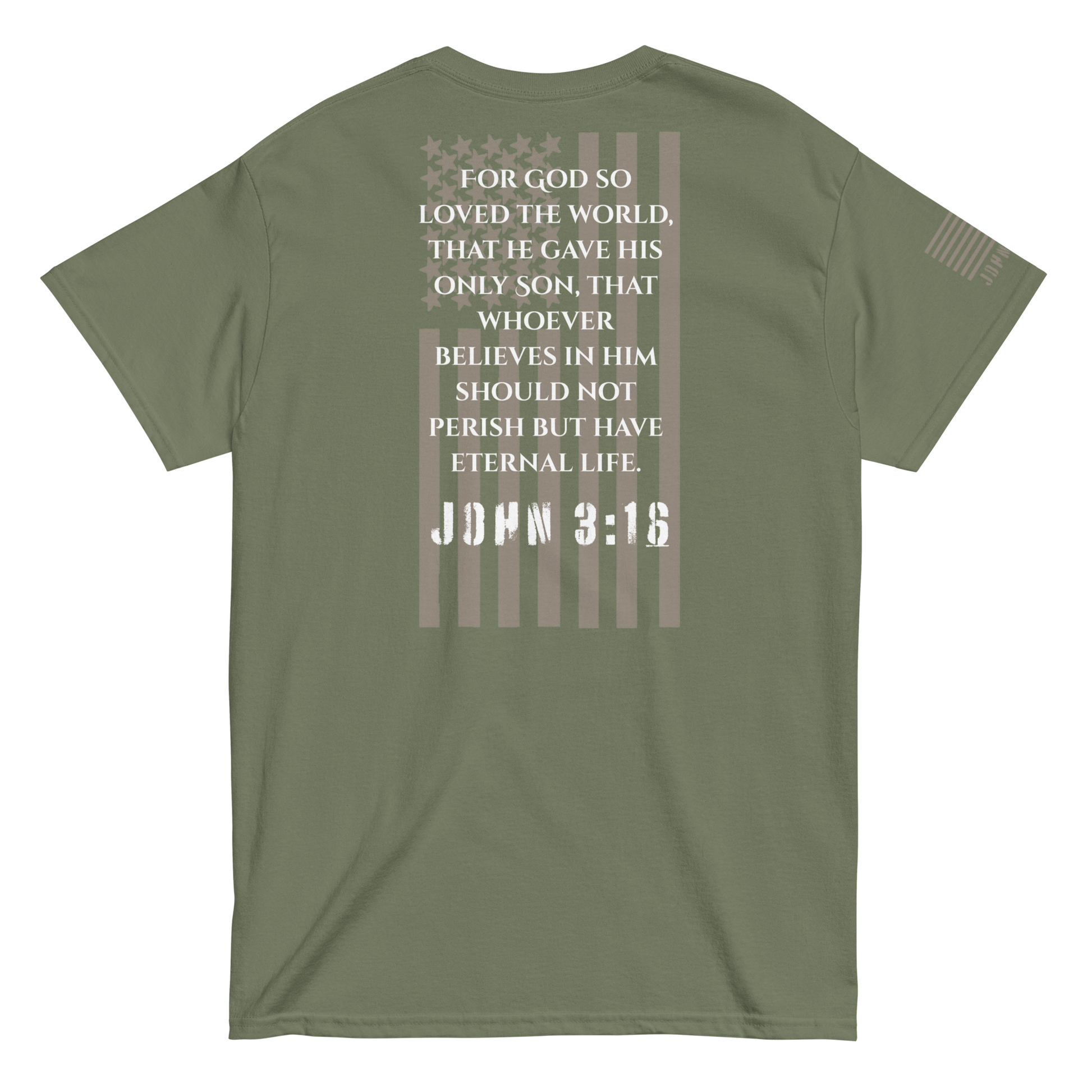 Gear up with purpose. This classic-fit Gildan 5000 tee is your daily reminder that belief is your strongest weapon. Inspired by John 3:16, built to go the distance.